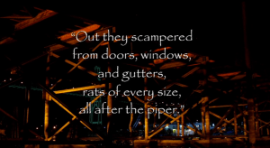 Long ago (and far away….), in the town of Hameln in Germany, the villagers were suffering from a plague of rats which were ruining food, clothing, and just generally making a bloody nuisance of themselves. Also, I’m thinking that they didn’t really have health departments back then but can we TALK ABOUT HOW MISERABLY DISGUSTING that would have been. Anyway, so the village is suffering a plague of rats. One day, a man came to the village and made a deal with the townsfolk; if they made it worth his while, he would soon rid the village of every rodent therein. The man was clothed in a brightly-coloured patchwork jacket, and so was called the Pied Piper (pied meaning to have two or more colours). After the villagers agreed to pay the Piper for getting rid of the rats, he proceeded to do so; playing a particular tune on his pipes (sources vary on whether it was a pan pipe or bagpipes), rats converged on his location and followed him into the river where the drowned.