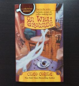 The immediate draw to this book was, as mentioned above, the fact that is was a book about, or heavily influenced by coffee. Books and coffee are two of my very favourite things in this world, and I am more than willing to read books that combine the two. On What Grounds is the first book in the Coffeehouse Mystery series, written by a husband-wife team under the pseudonym of Cleo Coyle.